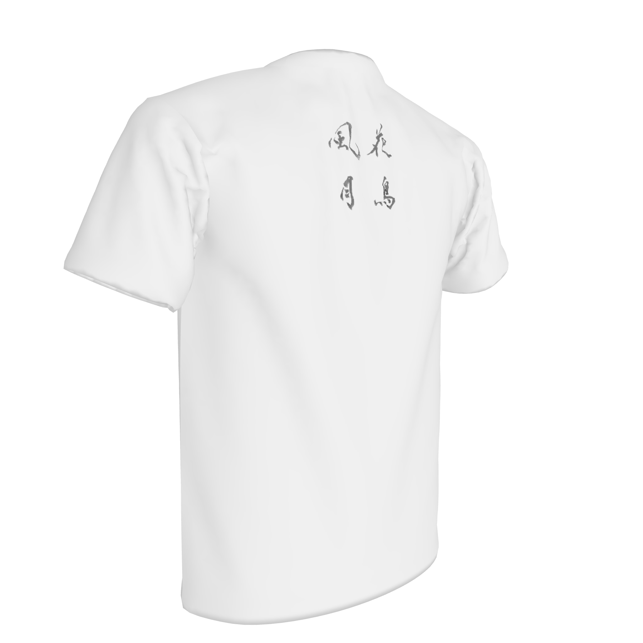 背中中央に珠花オリジナルの筆文字「一期一会/花鳥風月」が印刷された白Tシャツとなります。